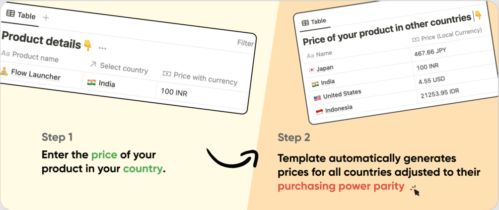 This Notion templates helps you find the price of your product in local currencies adjust to the countries GDP or economy.